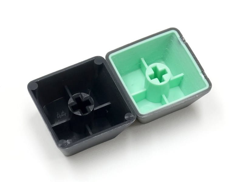 Thường được gọi tắt là double-shot, đây được coi là loại keycap tốt nhất. Thay vì in kí tự lên keycap, kí tự được đổ khuôn và đúc bằng nhựa màu, phần còn lại của keycap được đúc quanh kí tự đó bằng nhựa màu khác. Ưu điểm của phương pháp này là kí tự trên keycap sẽ không bao giờ có thể bị mờ, đồng thời double-shot keycap cũng tạo được độ tương phản màu cao do màu của kí tự không bị ảnh hưởng bởi màu của bề mặt keycap. Quy trình sản xuất phức tạp và giá thành làm ra của keycap này khá đắt đỏ và thiếu tính linh hoạt do mỗi kí tự lại cần một khuôn đúc riêng để sản xuất. Double-shot keycap bị giới hạn 2 màu mỗi keycap, mặc dù khuôn đúc keycap 3 lớp (triple shot) hoặc thậm chí 4 lớp (quadruple shot) vẫn được sản xuất nhưng giá thành quá cao và quy trình chế tạo rất phức tạp. Nhiều nhà sản xuất thường dùng pad-printing hoặc dye-sub để tạo thêm màu cho keycaps double shot.