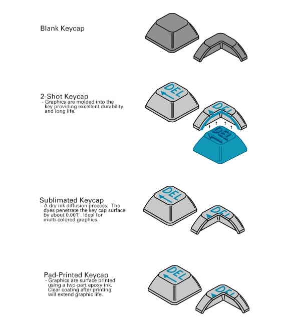 - Công nghệ xử lý ký tự: hiện tại có 3 công nghệ xử lý là in nổi, dye-sub (in nhiệt) và double shot (đúc 2 lớp) (tất nhiên vẫn còn một số công nghệ in khác). In nổi là phương pháp đơn giản nhất, màu sẽ được in trực tiếp lên keycap để tạo ra ký tự, kí tự được in bằng công nghệ này thường khá dễ bay màu. Dye-sub là công nghệ dùng nhiệt để làm cho mực thấm sâu vào keycap (chỉ có thể thực hiện với keycap PBT) keycap được xử lý bằng công nghệ này sẽ khó bay màu. Thêm nữa màu của keycap cũng sẽ rất tươi và bắt mắt. Còn công nghệ double shot (đúc 2 lớp) vì có 2 lớp nhựa, 1 lớp làm nền và 1 lớp làm ký tự nên những keycap loại này sẽ không thể bị mờ ký tự theo thời gian.