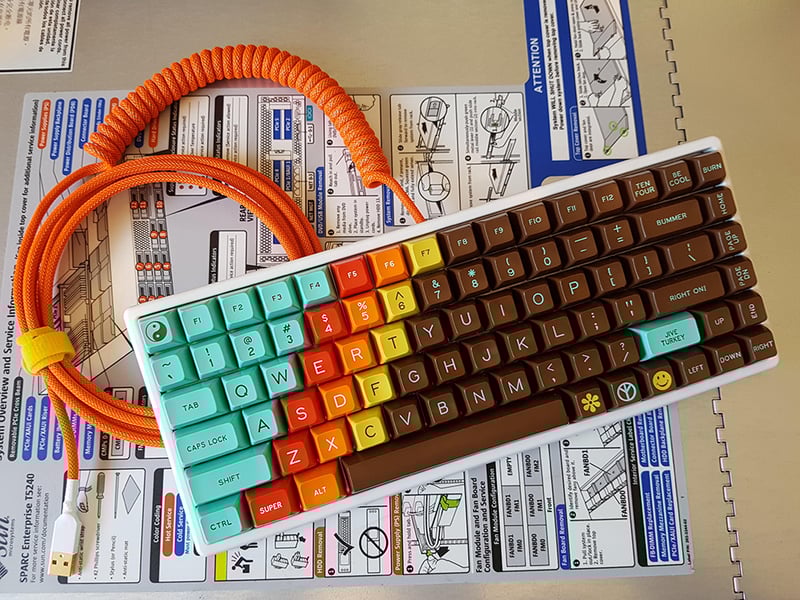 Cách 11: Thay cáp bàn phím Nhiều bàn phím cơ kết nối dây cũng dễ gây cảm giác nhàm chán khi dùng sợi dây cáp to đen rối nùi. Bạn hoàn toàn có thể thêm chút màu sắc tươi vui cho bàn phím của mình bằng cách thay một sợi cáp mới, dạng thẳng hoặc dạng lò xo xoắn, màu sắc tha hồ tùy chọn với sự đa dạng trên thị trường. Chỉ cần chắc chắn là đang mua đúng loại cáp có đầu vào và đầu ra tương thích.