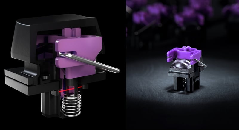 Trước khi đào sâu vào loại switch quang này, chúng ta nói lại một chút về các bàn phím hiện đang có trên thị trường. Rẻ tiền và kết cấu đơn giản nhất là Bàn phím màng (membrane keyboard - vẫn hay gọi là bàn phím thông thường). Nó hoạt động dựa trên một tấm màng cao su cung cấp lực lò xo và một miếng đệm dẫn nhỏ mặt dưới màng cao su này tạo ra sự tiếp xúc với PCB và màng khi bị ép lại. Sự tiếp xúc này tạo ra tiếp nhận ký tự cho máy tính. Với cách vận hành như vậy thì phím không còn đi xuống nữa khi đã nhận tác động. Nói chung là chỉ có hai chế độ, nhấn và không nhấn phím, không có đoạn giữa, không có điểm thực thi. Loại membrane switch này được cho là có tuổi thọ khoảng 5 triệu lần bấm. Switch cơ học là loại thứ hai, cao cấp hơn và vận hành phức tạp hơn so với membrane. Dưới mỗi keycap trên bàn phím cơ là các switch cơ học. Trong switch cơ có các lò xo đẩy khóa lên. Và khi khóa đi lên, hai dải kim loại nằm hai bên nó chạm tiếp xúc nhau, tạo ra tín hiệu cho máy tính. Theo cách này sự tiếp xúc hoàn thành trước khi phím chạm đáy, do đó tiết kiệm thời gian ngón tay gõ trên các phím (vì không cần gõ xuống hết chiều cao phím). Tất nhiên độ trễ này quá li ti nếu bạn chỉ gõ máy bình thường, nhưng thử dùng nó trong một trò chơi hỏa xa xem, bạn sẽ phải thốt lên ngạc nhiên vì sự khác biệt về tốc độ bấm phím giữa bàn phím bình thường và bàn phím cơ. Loại switch này được đánh giá là có tuổi thọ từ 20 triệu lần bấm trở lên, có cái còn đạt tới 70 triệu lần bấm, nghĩa là siêu bền.