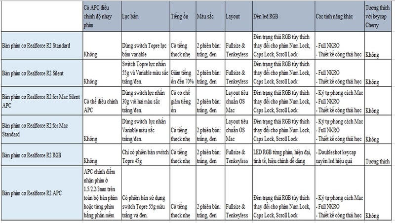 Realforce là con của Topre, nhánh sản phẩm bàn phím cơ cao cấp của chính hãng. Cho nên không lạ gì khi toàn bộ các bàn phím cơ Realforce đều dùng switch Topre và hầu hết đều có giá từ khá cao trở lên. Cho tới nay Realforce vẫn là một trong những nhãn hiệu bàn phím cơ hàng đầu được gọi tên trong bảng mơ ước của các anh em nghiện bàn phím cơ. Realforce nổi tiếng với dòng series Realforce R2, có dải SKU sản phẩm đa dạng (Standard, RGB, Silent, for Mac, APC). Đặc điểm cao cấp nhất của Realforce R2 chính là cảm giác bấm mượt mà, nhẹ nhàng, khi trả tay về lại nhẹ như tacticle brown của Cherry. So sánh đặc tính chi tiết của các dòng bàn phím cơ Realforce R2