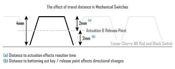 Là toàn chiều dài thanh trượt sẽ đi qua trong switch khi phím được ấn xuống. Nôm na có thể hiểu là giống như chiều cao của phím khi bấm xuống hết mức vậy (nhưng không hoàn toàn thế vì tổng hành trình muốn nói tới phần di chuyển của thanh trượt phía trong switch). Switch có tổng hành trình phím dài thì sẽ có độ bật ít hơn các switch có tổng hành trình ngắn. Với loại linear hoặc tacticle không kèm clicky thì tổng hành trình ít có ý nghĩa hơn vì điểm truyền động (là nơi tín hiệu được nhận) nằn đâu đó ở giữa hành trình này. Cho nên các switch linear và tacticle có độ nhạy phím cao hơn, phím nhận tín hiệu nhanh và bật lại cũng nhanh.