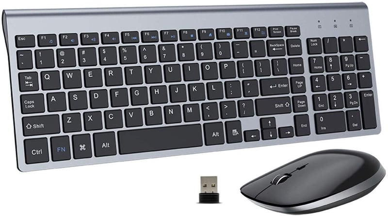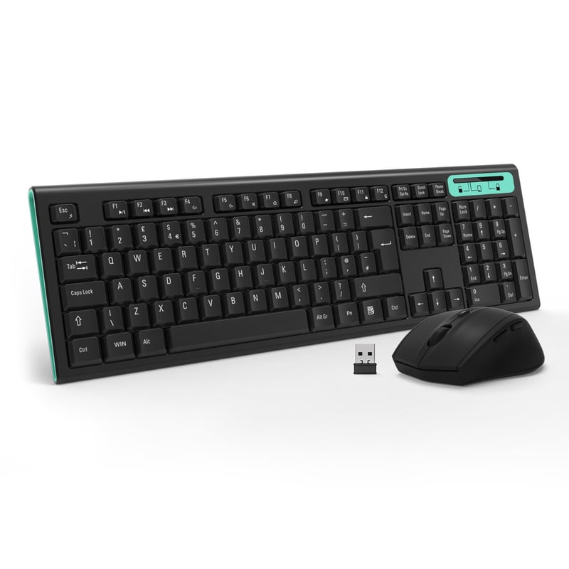 Đây là combo bàn phím chuột không dây cho tín hiệu tuyệt vời trong vòng 49.2 ft. Tuổi thọ pin của bàn phím là 15 tháng, của chuột là 24 tháng. Bàn phím được thiết kế đẹp, thanh lịch mang lại cảm giác thoải mái khi bấm, có phản hồi xúc giác tốt, gõ mượt mà nhẹ nhàng. Cả chuột và bàn phím đều cùng đặc điểm là không tạo ra tiếng ồn khi dùng. Combo không dây này đi kèm với đầu thu nano kết nối cả hai thiết bị.