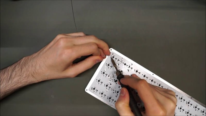 Cách kết nối mọi phụ kiện lại với nhau sẽ hoàn toàn phụ thuộc vào loại linh kiện và bàn phím mà bạn đang muốn build. Ở đây tôi sẽ chỉ có thể nói cách làm của mình dựa trên bảng tôi đang định build. Cần kiên nhẫn khi đưa bộ ổn định vào Đầu tiên tôi cài bộ ổn định vào bảng mạch. Bạn cần chắc chắn đặt đúng vị trí của chúng để không gây ra lỗi nền tảng nào cho bàn phím. Nhiều PCB hỗ trợ nhiều hơn một bố cục, nghĩa là sẽ có một số lỗ nhất định mà bạn không dùng. Cho bàn phím lần này tôi chọn bố cục UK, nghĩa là có một phím Shift trái ngắn hơn không cần bộ ổn định, và một phím Enter có bộ ổn định gắn theo chiều dọc. Bởi vì em bàn phím này sẽ có cỡ 75% nên phím Shift phải cũng cần ngắn hơn để đủ chỗ cho bộ mũi tên. Hãy thuộc nằm lòng bố cục bàn phím của mình trong bước đưa bộ ổn định vào. Nếu không sẽ rất phiền nhiễu ở các phần sau. Bộ ổn định Cherry mà tôi đặt mua là ở dạng tháo rời từ đầu. Nên tôi cần đặt các stem ổn định vào các vỏ tương ứng (housing) trước khi gắp thanh kim loại vào cả hai mặt. Hơi khó một chút, nhưng khi đã làm được một hai lần rồi thì những lần sau không thành vấn đề nữa. Sau khi hoàn tất thì đưa toàn bộ ổn định kẹp nó vào hai lỗ của PCB. Tiếp theo là các switches. Giống như khi làm việc với bộ ổn định, chúng ta cũng cần chú ý để các switch nằm đúng vị trí theo bố cục bảng dựng. Bạn có thể double check trước bằng cách áp keycaps vào switch tương ứng của nó, đặc biệt với những switch đa hướng (multiple placement options). Sau đó các switch vào đúng lỗ. Việc của bạn là chỉ cần nhớ vị trí các lỗ này sau khi hoàn tất. Tốt nhất nên lấy điện thoại chụp hình lại cho chắc. Đối với plate-mounted board, tôi cần phải đặt từng switch vào PCB thông qua plate. Sau khi đặt tất cả vào, lật PCB lại và hàn. Hàn cũng là một quy trình gây khó khăn và nản chí nhiều anh em. Nếu anh em chưa biết cách hàn thì có thể xem các video hướng dẫn trên youtube. Còn với tôi thì chỉ muốn chia sẻ một vài lưu ý sau khi hàn: