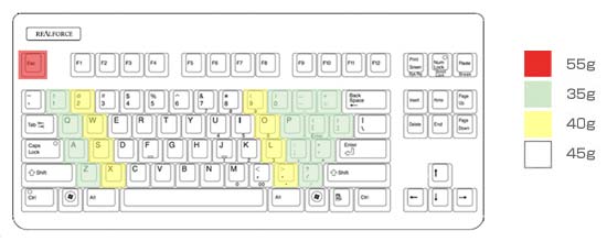 - Còn Variable thì lực nhấn trên bàn phím được chia đều thành từng cụm với lực nhấn từ 30g, 45g, 55g. “Variable” là một phiên bản bàn phím được chia lực theo từng cụm khác nhau. Đây là điểm thể hiện sự tài tình của Nhật Bản và mức độ công thái học cực cao trong các bàn phím cơ Nhật Bản nói chung. Tài tình ở chỗ các cụm khác nhau có lực nhấn khác nhau, nếu như càng gần ngón út, lực ấn càng nhẹ để đảm bảo thích nghi và luôn hỗ trợ tốt nhất cho hoạt động bấm phím tự nhiên của người dùng.