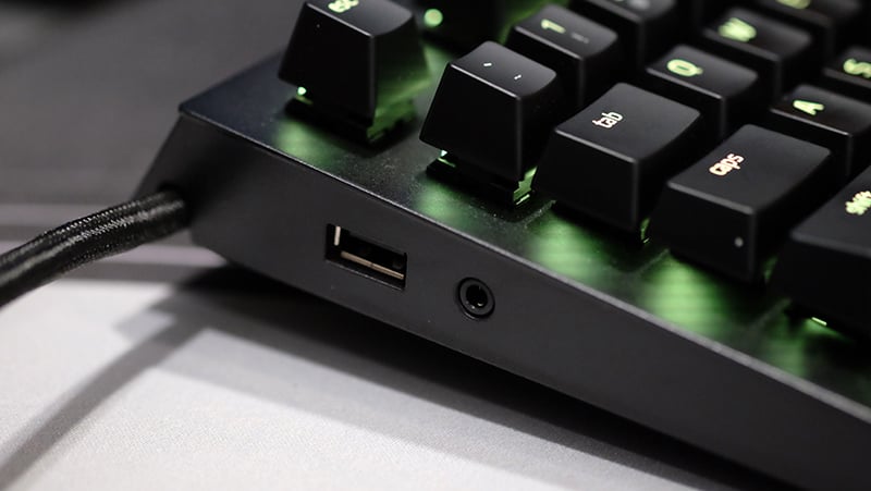 Bên hông của bàn phím Razer Blackwidow Elite có cổng kết nối USB 2.0 và 3.5mm tiện dụng có thể dùng để gắn với tai nghe, chuột hoặc USB đều được. Phần dây cáp nối với PC cũng được thiết kế thông minh với kiểu cáp và bộ phận cố định nhỏ đi kèm để dây không bị rối và luôn gọn gàng trong quá trình dùng.