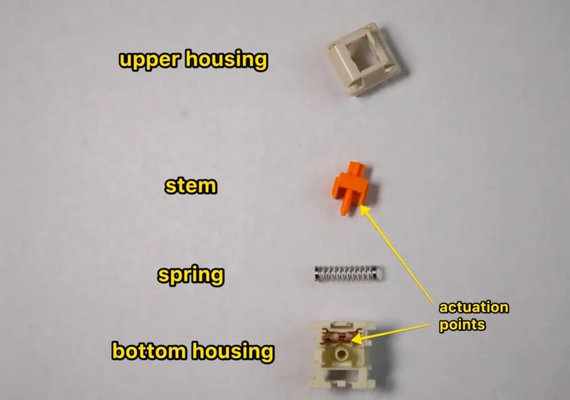 Với các loại switch khác nhau, chất liệu thành phần, tỉ lệ pha phối của các yếu tố trong chất liệu có thể khác nhau, nhưng nhìn chung đều đi theo nguyên tắc tiêu chuẩn từ Cherry MX như sau: