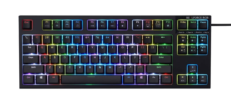 - Realforce R2 RGB là một dòng bàn phím cơ cao cấp khác của Topre khác với các dòng bàn phím trước đó vì có hệ đèn LED RGB 16,8 triệu màu tùy chỉnh trên từng phím.