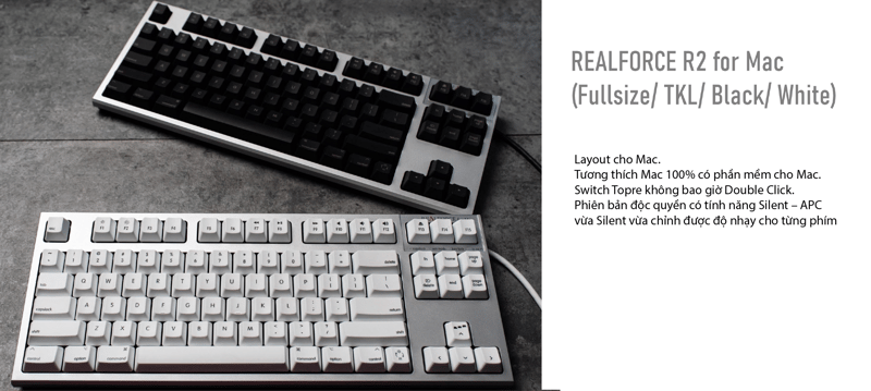 Để phục vụ cho lượng khách hàng dùng máy Mac ngày càng nhiều, Topre đã cho ra dòng Realforce R2 for Mac đầu tiên đặc chủng. Để tương đồng với độ “nghệ” của sản phẩm nhà Táo thì dòng R2 for Mac thì có thiết kế rất chi là tinh tế, thậm chí là sắc nét hơn so với các bản khác của Realforce. Tại Việt Nam phổ biến nhất là hai model: