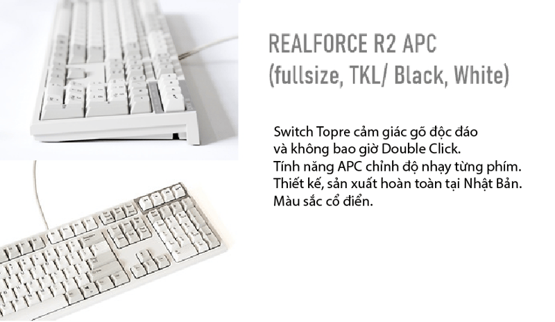 - Realforce R2 APC là dòng bàn phím cao cấp độc quyền của Topre với tính năng tùy chỉnh độ nhạy phím (APC - Actuation Point Changer) không có trên bất kỳ bàn phím cơ nào khác. Với tính năng độc đáo nào anh em có thể tùy ý chọn độ nhạy phím ưa thích cho từng phím riêng lẻ, thông qua tổ hợp phím hoặc phần mềm. Có ba mức nhạy phím 1.5mm, 2.2mm và 2mm (lực nhấn chuẩn 55g). Khả năng tùy chỉnh này giúp tăng tốc độ gõ lên tối đa và phù hợp rất nhiều dạng công việc, giải trí khác nhau cũng như sở thích riêng của người dùng.